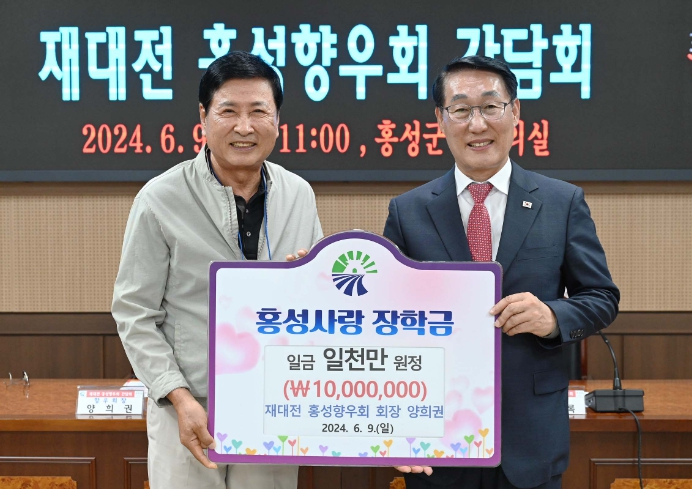 [뉴스서울] 홍성군은 재대전홍성향우회 양희권 회장이 지난 9일 홍성군청을 방문해 홍성사랑장학금 1,000만원을 기탁했다고 밝혔다.