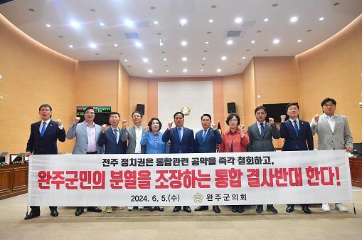 5일 완주군의회에 따르면 이날 열린 제284회 정례회 본회의에서 “정치적 이해관계에 따라 원칙과 기준이 무시되는 통합에 반대한다”며 반대입장을 분명히 밝히면서 서남용 의장이 대표 발의한 결의문을 만장일치로 의결·채택했다.