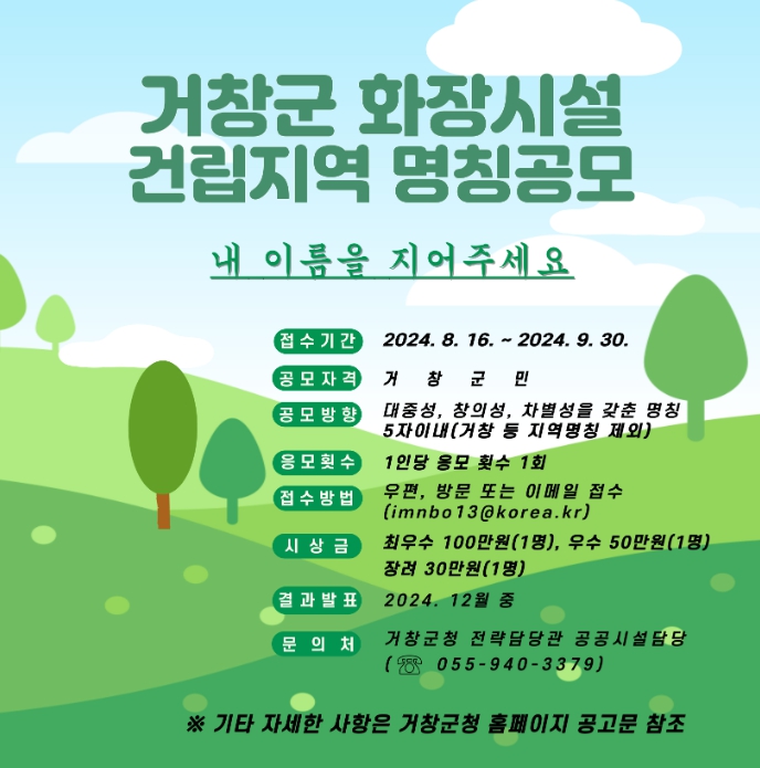 이번 공모전을 통해 거창군은 ‘거부감 없는 공원 같은 화장시설’의 이미지를 널리 부각시키며 대중성, 창의성이 돋보이는 명칭을 선정할 예정이다.