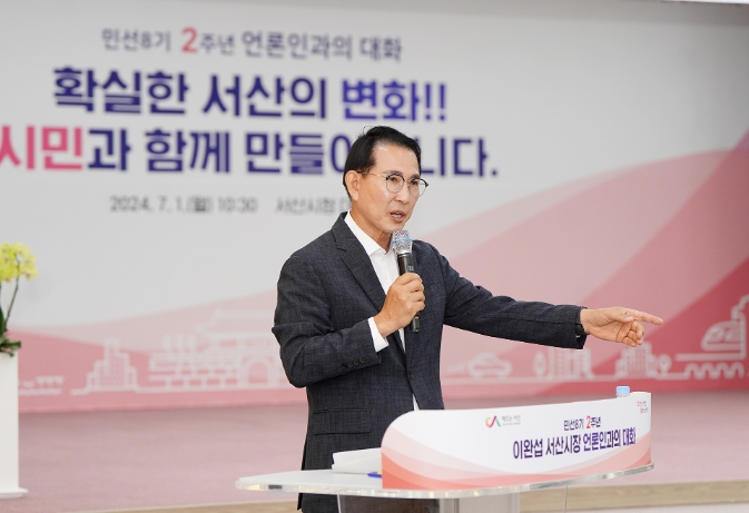 [뉴스서울] 이완섭 서산시장이 1일 시청 대회의실에서 민선8기 2주년을 맞아 언론인과의 대화를 갖고 2년간의 성과와 앞으로 시민과 비상할 2년에 대한 청사진을 밝혔다.
