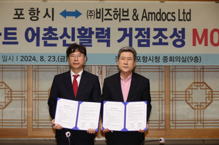[뉴스서울] 포항시는 23일 시청 중회의실에서 사물인터넷(IoT)과 인공지능(AI)을 활용한 글로벌 솔루션 선도기업 ㈜비즈허브와 ‘AI 스마트 어촌 신활력거점 조성’을 위한 업무협약을 체결했다.