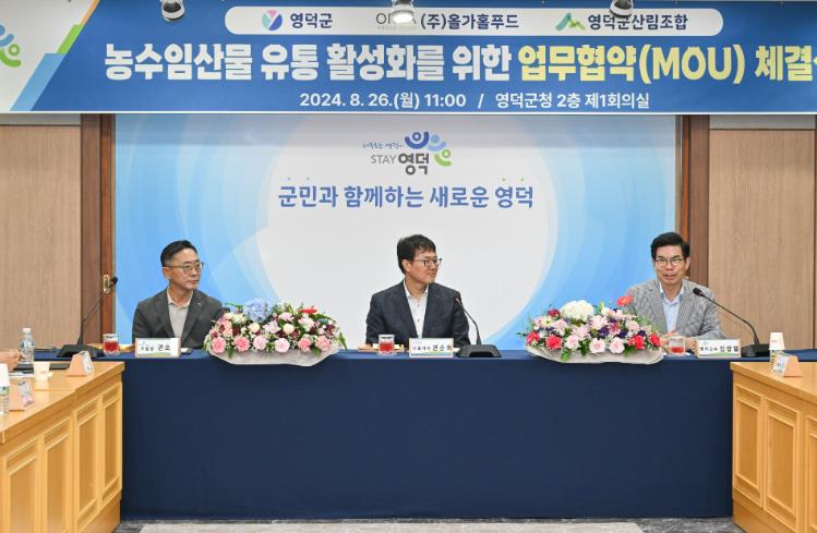 [뉴스서울] 영덕군은 지역에서 생산하는 우수한 농·수·임산물의 판로를 확대하고 유통을 활성화하기 위해 26일 친환경 식품기업 ㈜올가홀푸드 및 영덕군산림조합과 업무협약을 체결했다.