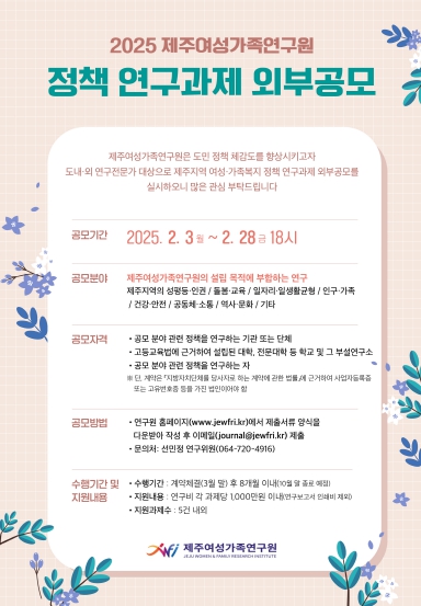 2025년 정책 연구과제 외부공모 마감일은 2월 28일이며, 구체적인 공모분야는 제주여성가족연구원의 설립 목적에 부합하는 연구로, 제주지역의 ①성평등・인권, ②돌봄・교육, ③일자리・일생활균형, ④인구・가족, ⑤건강・안전, ⑥공동체・소통, ⑦역사・문화 등이다.