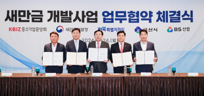 전북특별자치도에 따르면 24일 군산 베스트웨스턴호텔에서 김관영 전북자치도지사와 김기문 중소기업중앙회 회장, 김경안 새만금개발청장, 강임준 군산시장, 새만금관광레저주식회사의 대표회사인 김만겸 BS산업 대표이사가 참석한 가운데 신시야미 관광개발사업의 성공적 추진을 위한 업무협약이 체결됐다.