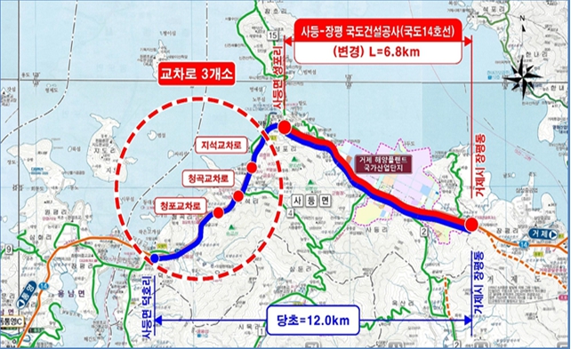 ・(사업구간) 거제시 사등면 성포리 부터 장평동 ・(사업규모) 도로확장(4→6차로) L= 6.8km, 교차로 개량 3개소(지석,청곡,청포) ・(총사업비) 983억 원(타당성재조사 기준)