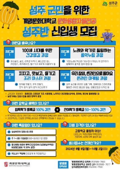[뉴스서울] 계명문화대학교는 성주군민을 위한 특화된 교육과정 제공을 통해 지역 사회에 기여하고 문화 및 예술, 건강, 요리, 온라인 마케팅 등 다양한 분야의 지식을 융합적으로 습득할 수 있도록 지원하기 위한 문화융합자율전공학과 성주반을 신설했고 신입생을 모집한다.
