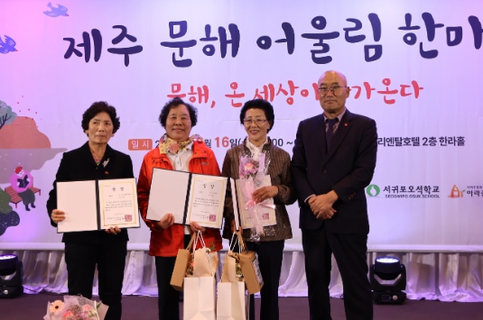 식순으로는 성인문해 교육생 대상 전국 및 제주지역에서 실시한 시화 공모전에 대한 결과 발표 및 시상식을 진행했고, 전국에서는 △시화 2명, △엽서 3명이 선정됐고, 제주에서는 △시화 20명, △엽서 2명이 선정되어 제주특별자치도지사상 등을 전달했다.