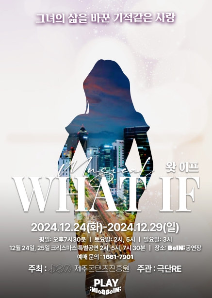 탄탄한 서사와 드라마틱한 음악, 감각적인 안무를 갖춘 뮤지컬 WHAT IF(왓 이프)는 12월 24일부터 12월 29일까지 제주 블랙박스 공연장 BeIN;(비인)에서 만나볼 수 있으며, 공연에 대한 자세한 내용은 비인 홈페이지에서 확인할 수 있다.
