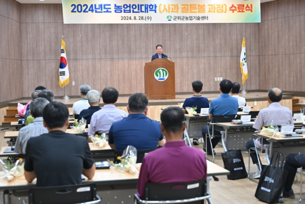 [뉴스서울] 군위군은 8월 28일 농업기술센터 대강당에서 농업전문 인력양성을 목표로 운영한 군위군 농업인대학 사과 골든볼 과정 수료식을 가졌다.
