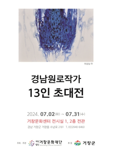 [뉴스서울] (재)거창문화재단은 7월 2일부터 7월 31일까지 거창문화센터 내 전시실에서 ‘경남원로작가 13인 초대전’을 개최한다.