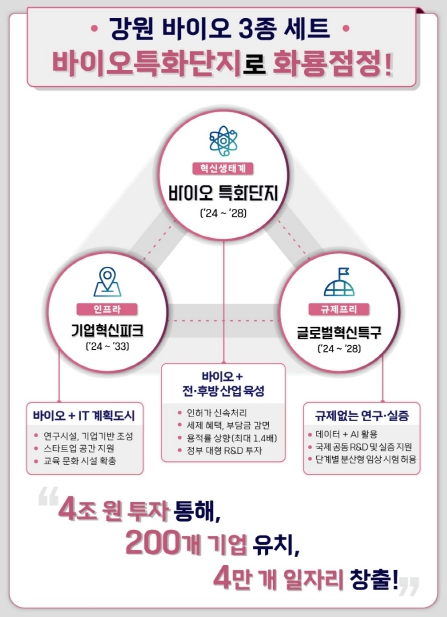 바이오 특화단지는 산업통상자원부 주관으로 이미 조성되어 있는 10개(춘천8, 홍천2) 산업단지에 바이오 특화단지 기능을 추가하는 것으로 인허가 신속처리, 세제혜택, 부담금 감면, 정부 대형 R&D 투자 등의 혜택이 지원된다.
