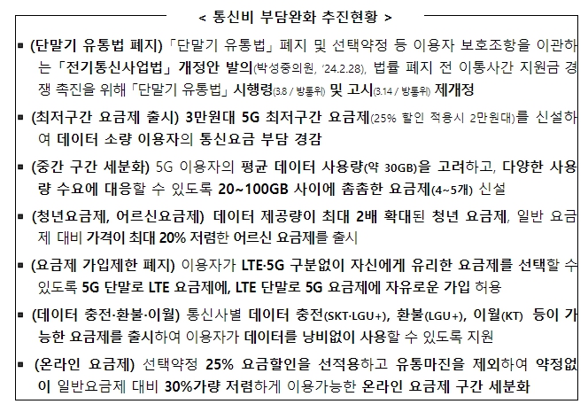 이와 더불어, 국민들의 통신 요금 부담을 완화하기 위해 통신사와 3만원대 5G 최저구간 요금제 출시에 대해서도 협의하고 있다. 그간 이용자가 자신의 이용패턴에 알맞은 요금제를 선택함으로써 통신 요금 부담이 낮아질 수 있도록 요금제 다양화를 적극 추진해온 결과, 5G 요금제 수가 대폭 늘어(’22.6월, 51종 → ’24.3월, 162종)나며 대다수 이용자가 자신에게 맞는 요금제로 이동하여 통신비 지출을 절감할 수 있게 됐다. 이어서 3만원대 5G 요금제 출시가 완료되면, 데이터를 적게 쓰는 이용자의 통신비 부담도 절감되며 통신비 부담 완화에 보다 크게 기여할 수 있을 것으로 보인다.