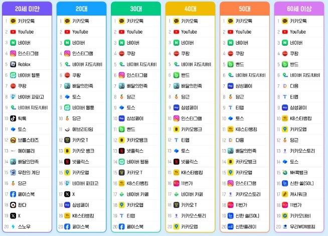 ▲ 2023년 세대별 앱 사용자 순위 TOP 20 |