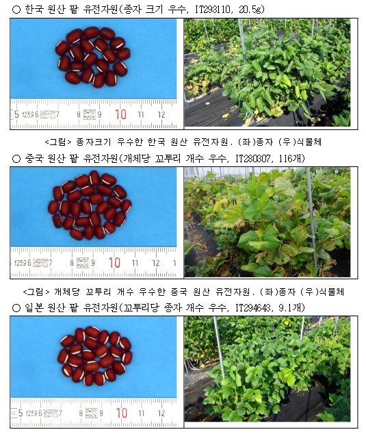 또한, 유전정보를 비교했을 때 우리 원산 팥은 종자 크기, 중국은 개체당 꼬투리 수, 일본은 꼬투리당 종자 수와 관련한 유전적 다양성이 다른 나라에 비해 현저히 낮았다. 이를 통해 예부터 그 나라에서 선호하던 농업 형질에 따라 반복적인 개체 선발이 이뤄져 해당 유전형질이 고정됐음을 추측할 수 있었다.