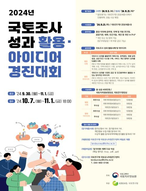 [뉴스서울] 국토교통부 국토지리정보원은 국토 조사 성과의 확산 및 새로운 활용 방법을 찾기 위해 9월 30일부터'2024년 국토 조사 성과 활용·아이디어 경진대회'를 개최한다.