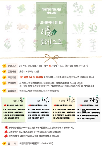 [뉴스서울] 이천시 어린이도서관은 4월 6일부터 그림책 기반의 생태교실 프로그램인 '도서관에서 만나는 리틀 포레스트'를 운영한다고 밝혔다.