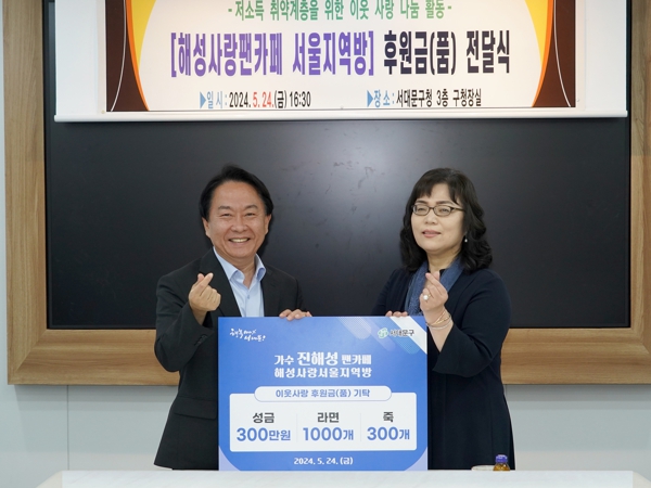 [뉴스서울] 서대문구는 최근 가수 진해성 공식 팬카페 ‘해성사랑서울지역방’로부터 취약계층을 위한 성금 300만 원, 라면 1,000개, 즉석 죽 300개를 기탁받았다고 28일 밝혔다.