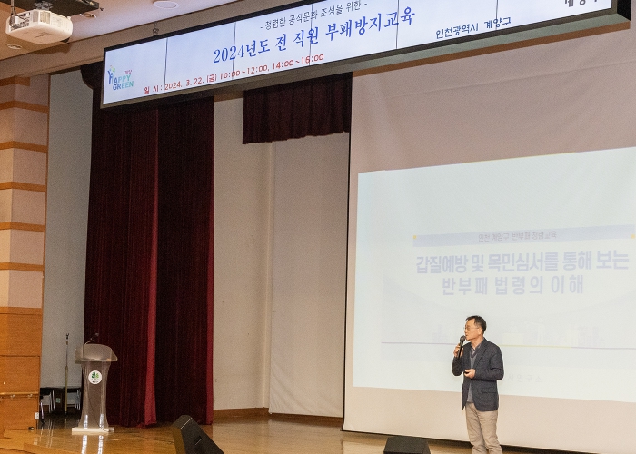 [뉴스서울] 인천광역시 계양구가 청렴한 공직문화 조성을 위해 지난 20일과 22일, 계양구청 6층 대강당에서 ‘2024년 전 직원 부패방지교육’을 추진했다.