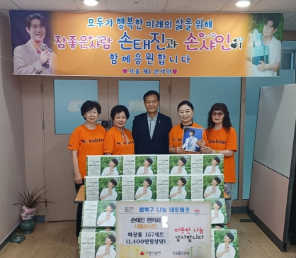[뉴스서울] 서울 성북구에 가수 손태진 공식팬카페 ‘손샤인(SonShine)’ 서울지역 회원들이 1,400만원 상당의 화장품 157세트를 기부헸다.