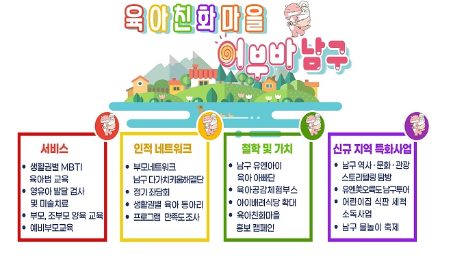 ‘육아친화마을’이란 부모와 아이 모두의 건강하고 행복한 삶을 지원하는 마을로, 남구는 0~5세 영유아와 부모를 대상으로 아이낳고 키우기 좋은‘어부바(어린이와 부모가 바라는) 남구’를 본격적으로 추진한다. 사업수행에는 용호종합사회복지관이 함께 협력한다.