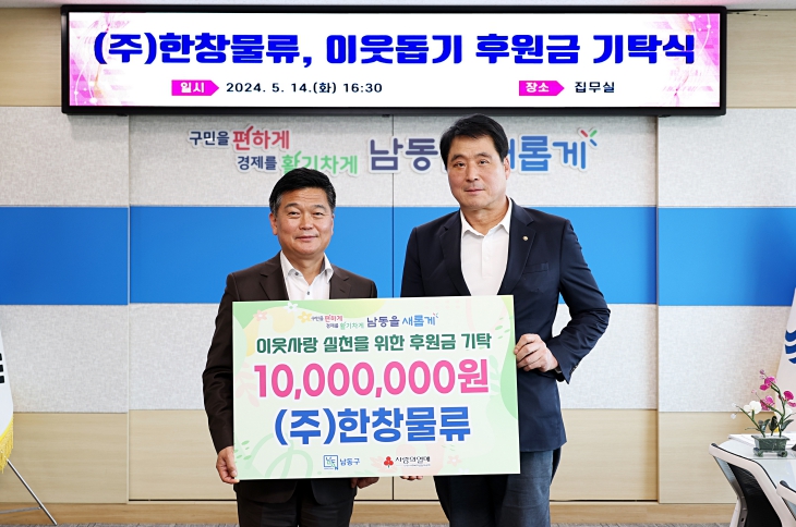 [뉴스서울] 인천시 남동구는 최근 ㈜한창물류로부터 이웃돕기를 위한 후원금 1천만 원을 기탁받았다고 21일 전했다.