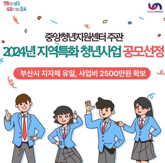 2024년 지역특화 청년사업은 지역 청년의 수요와 특성에 맞는 지역 특화 프로그램의 개발·추진을 지원하기 위한 사업으로, 부산시에서는 남구가 유일하게 선정됐다.
