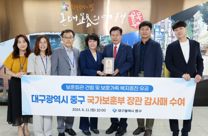 [뉴스서울] 대구 중구는 보훈회관 건립 및 보훈가족 복지증진에 대한 기여와 공로를 인정받아 11일 국가보훈부 장관 감사패를 받았다.