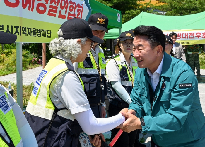 | ▲ 김동근 시장이 6월 26일 ‘2024년 풍수해 대비 모의훈련’에 참여해 유관기관 관계자들을 격려하고 있다. |