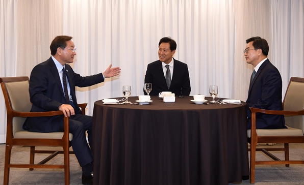 ▲ 유정복 인천광역시장이 2023년 11월 서울 프레스센터에서 오세훈 서울시장, 김동연 깅기도지사와 회동하고 있다. |