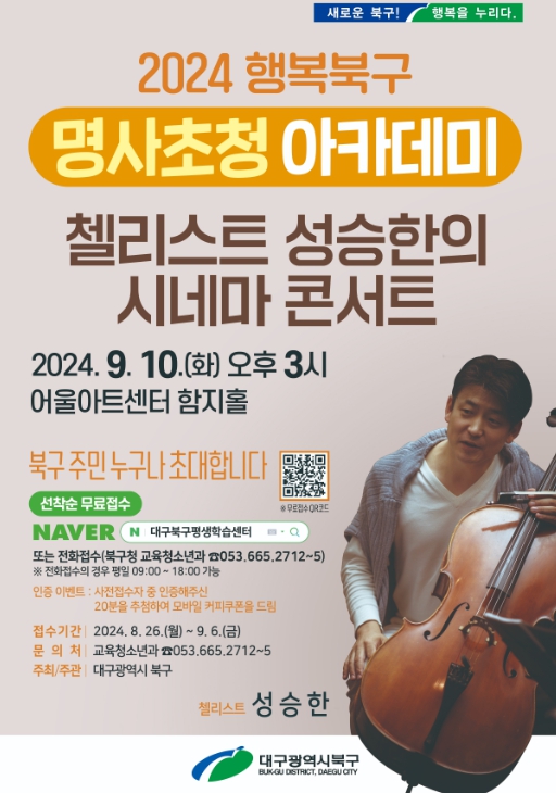 [뉴스서울] 대구시 북구청은 9월 10일 오후 3시, 어울아트센터에서'2024 행복북구 명사초청 아카데미'9월 강연을 개최한다.