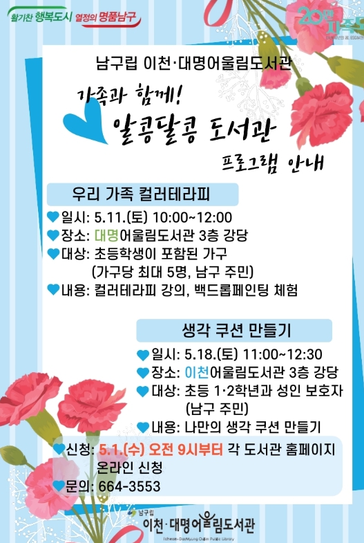 5월 11일 토요일 10시 대명어울림도서관에서 ‘우리 가족 힐링 컬러테라피’를, 5월 18일 토요일 11시 이천어울림도서관에서 ‘생각 쿠션 만들기’를 운영한다.