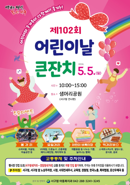 [뉴스서울] 대전 서구가 제102회 어린이날을 맞아 내달 5일 오전 10시 샘머리공원 일대에서 어린이날 행사를 개최한다.