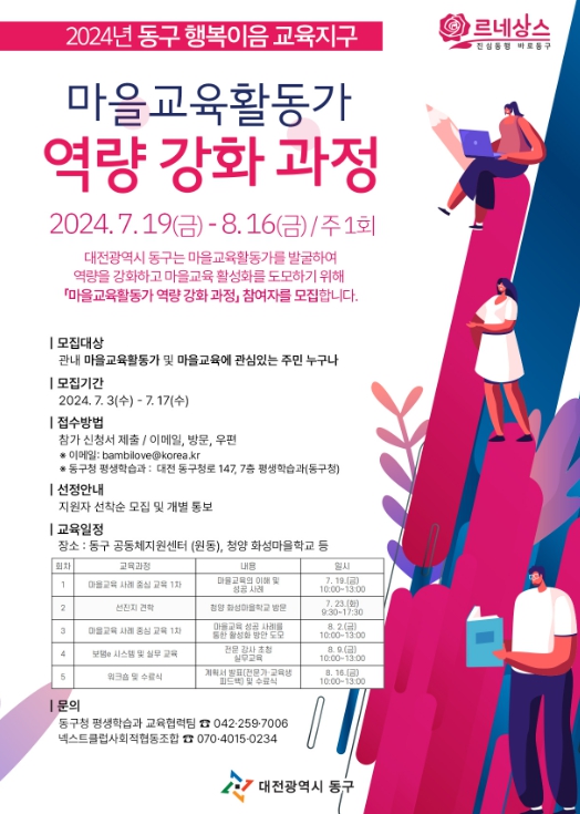 [뉴스서울] 대전 동구는 2024년 동구 행복이음 교육지구 ‘마을교육활동가 역량 강화 과정’ 참여자를 이달 18일까지 모집한다.