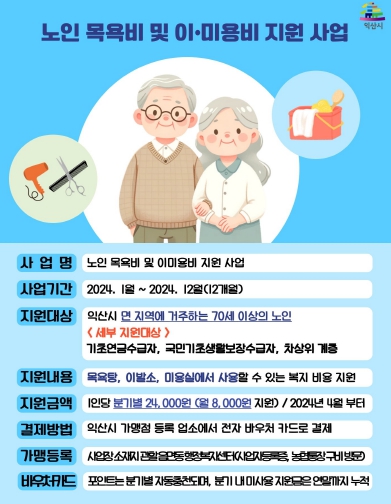 2020년 도입한 익산시 노인 목욕비 및 이·미용비지원 사업의 지원 대상은 면 지역에 주민등록을 두고 거주하는 만 70세의 국민기초생활보장수급자, 기초연금수급자, 법정 차상위 계층 등으로 현재 1만 1,885명이다.