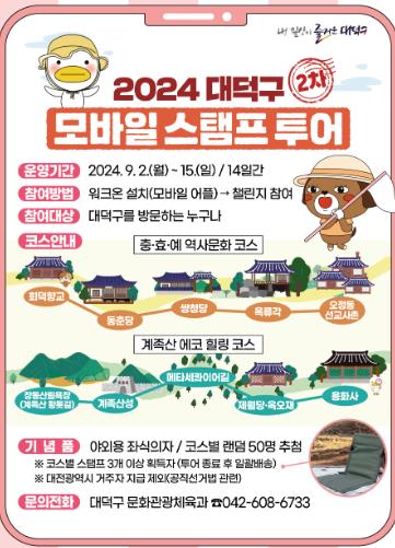 [뉴스서울] 대전 대덕구는 오는 9월 2일부터 15일까지 대덕구의 주요 관광명소를 즐길 수 있는 ‘2024년 2차 모바일 스탬프 투어’를 운영한다고 밝혔다.