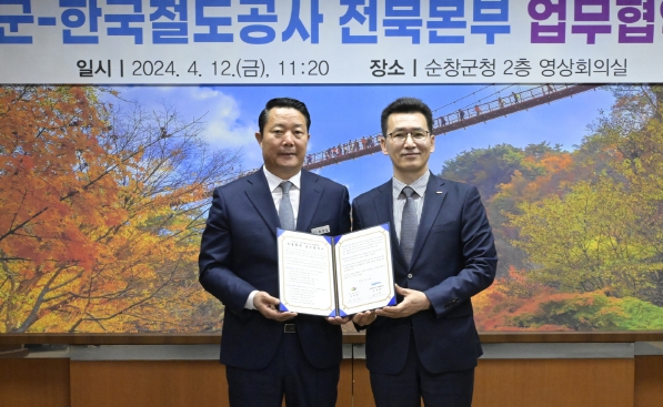 [뉴스서울] 순창군은 12일 한국철도공사 전북본부와 상생협력 업무협약을 맺고 지역사회 발전 및 철도관광 활성화를 위하여 두 손을 잡았다고 밝혔다.
