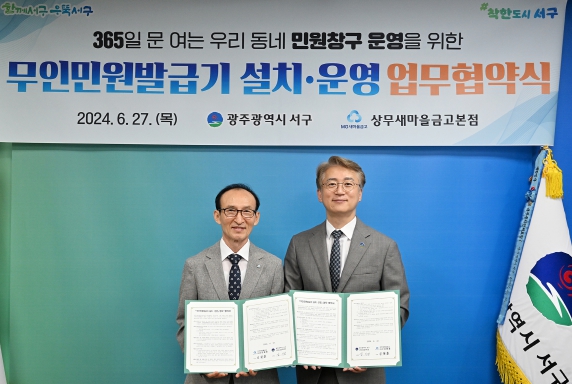[뉴스서울] 광주광역시 서구와 상무새마을금고가 주민들의 민원 편의 증진을 위해 손을 맞잡았다. 양 기관은 27일 상무새마을금고 본점 내 무인민원발급기를 신규 설치하고, 상호 협력관계를 바탕으로 효율적인 운영을 위해 업무협약을 체결했다.