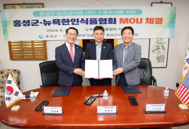 홍성군에 따르면 현지시간 20일 오후 6시 뉴욕 베이사이드에 위치한 뉴욕한인식품협회에서 이용록 홍성군수와 이성찬 홍성군기업인협의회장, 박광민 뉴욕한인식품협회장이 3자 MOU를 체결하는 시간을 가졌다.