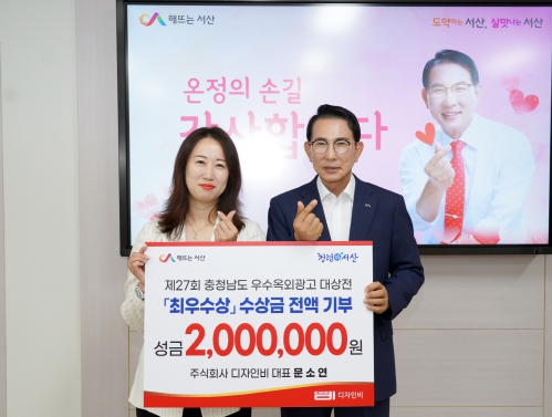 [뉴스서울] 충남 서산시는 5일 디자인비(Design B)가 제27회 충남 우수옥외광고 대상전을 통해 획득한 최우수상 수상금 200만 원을 기탁했다고 밝혔다.