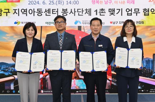[뉴스서울] 대구 남구는 지난 25일 초록우산어린이재단 대구지역본부, 지역아동센터 대구지원단, 남구지역아동센터 연합회와 함께 "남구 지역아동센터 봉사단체와 1촌 맺기" 사업 협약(MOU)을 체결했다고 밝혔다.