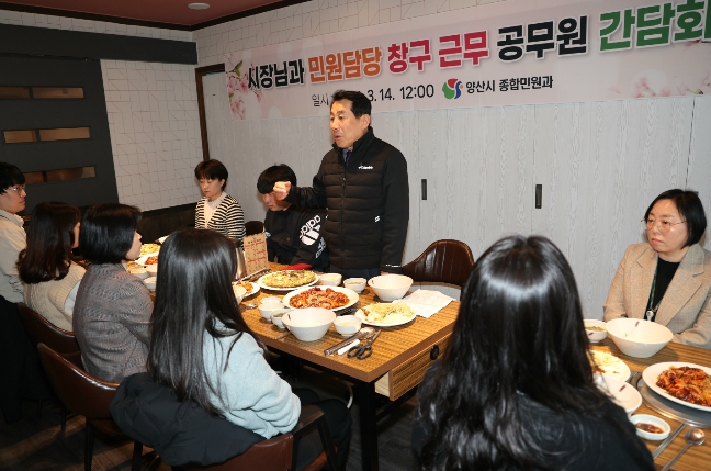 [뉴스서울] 양산시는 14일 관내 음식점에서 나동연 양산시장과 민원창구 담당공무원과의 간담회를 갖고 행정의 최일선에서 근무하는 민원담당 공무원들과 다양한 의견을 공유하는 소통의 시간을 가졌다.