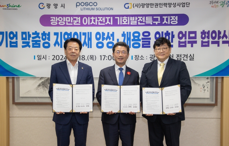 [뉴스서울] 광양시는 어제(18일) 시청 접견실에서 광양만권 이차전지 기회발전특구 지정에 따른 기업 맞춤형 지역인재 양성 및 채용 업무협약을 체결했다고 밝혔다.