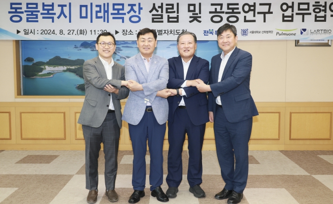 전북자치도에 따르면 27일 도청 회의실에서 김관영 도지사와 ㈜풀무원 이효율 총괄CEO, 서울대학교 산학협력단 김재영 단장, ㈜라트바이오 장 구 대표이사가 참석한 가운데 동물복지 미래목장 설립 및 공동연구를 위한 업무협약을 체결했다.