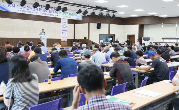 행사는 한우자조금 동영상 시청을 시작으로 가축방역 및 한우산업 발전에 기여한 공로자에 표창과 감사패 전달, 개회사 및 축사, 축산환경법 및 번식우 사양관리 교육, 행정과의 간담회 순으로 진행되었으며, 야외 주차장에서는 축산기자재 전시회도 함께 열려 한우 농가들의 큰 호응을 얻었다.