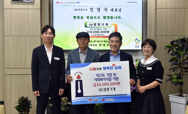 정성주 김제시장은 “경기 악화로 어려운 상황에서도 이웃에게 관심을 갖고 성금을 기탁 해주신 (유)광원기계에 감사드리며, 기탁해 주신 성금은 지역 내 저소득 가정과 취약계층에 잘 전달하겠다”고 전했다.