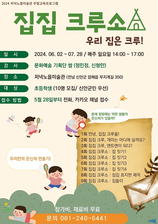 [뉴스서울] 신안군 저녁노을미술관은 주말 문화예술 교육프로그램 《집집 크루소 : 우리 집은 크루!》 참여자를 신안군에 주소를 둔 초등학생을 대상으로 5월 28일부터 31일까지 4일간 모집한다.