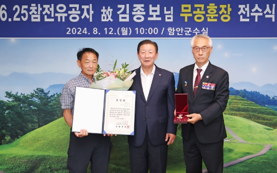 [뉴스서울] 함안군은 12일 오전 10시 군수실에서 6.25전쟁 참전유공자 故김종보의 은성화랑 무공훈장 전수식을 가졌다.