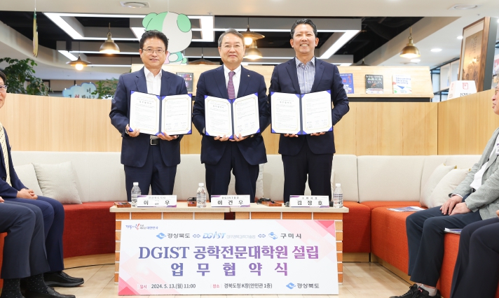 13일 경북도청 K창에서 열린 업무협약 체결식에서 이철우 도지사, 이건우 DGIST 총장, 김장호 구미시장 등이 참석한 가운데 DGIST 공학전문대학원을 2025년 7월까지 개원하기로 합의했다.