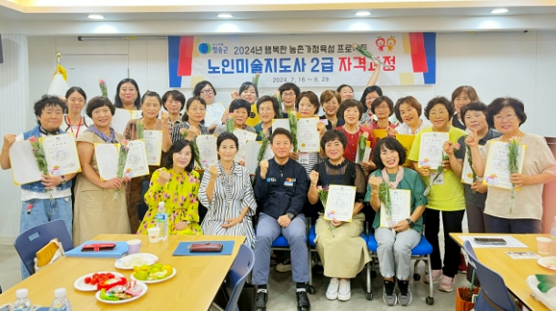 ‘노인미술지도사 2급 자격과정’은 노인들의 심리 이해와 삶의 질 향상에 도움을 드리는 전문 인력 양성 교육으로 수강생 모집 단계부터 지역 여성농업인들에게 큰 호응을 얻어왔다.