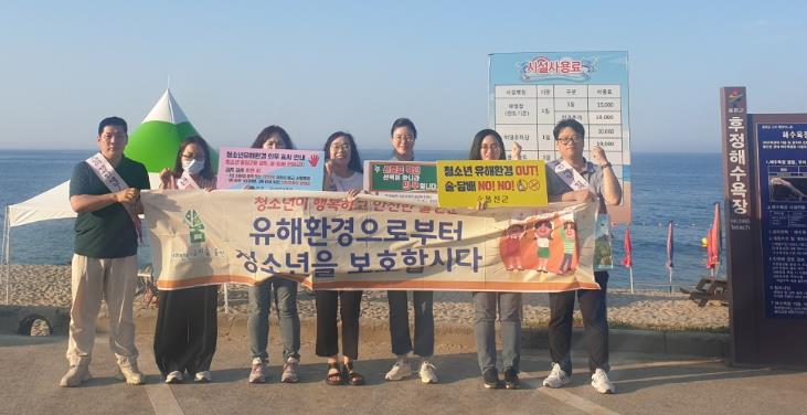 해수욕장 근처 편의점 및 식당 등을 방문하여 청소년의 음주·흡연 등 일탈행위와 19세 미만 주류·담배 판매금지 표시 여부를 단속하고, 신분증 확인 생활화를 위해‘청소년 유해환경 OUT’리플릿을 배부했다.